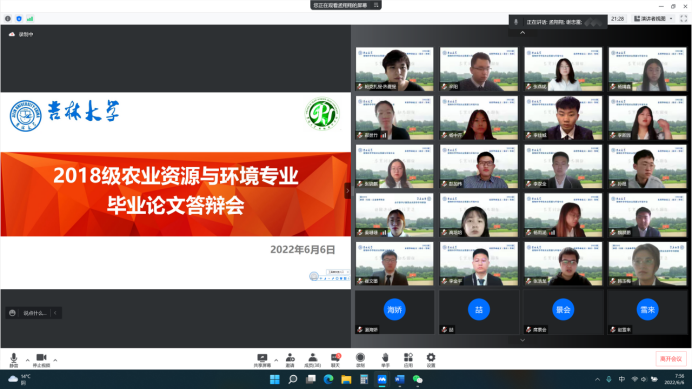 因疫情防控工作需要,为全面落实taptap点点体育关于本科毕业生线上答辩的要求,taptap点点体育于2022年6月6日顺利开展了2022届农业资源与环境专业本科毕业论文线上“云”答辩工作。农业资源与环境专业2018级25名本科毕业生的答辩依托于“taptap点点体育本科毕业答辩数字化平台(iThesis)”,充分利用信息化技术,整个答辩过程全程录音录像,答辩过程严谨规范、秩序井然,以一种特殊的方式为大学四年画上了圆满句号。