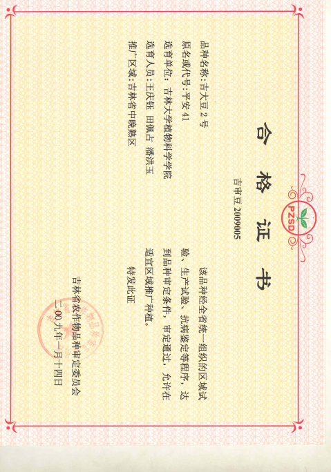 吉大豆2号,亚有限结荚习性,圆叶、白花、灰毛。籽粒圆形,种皮黄色,有光泽,脐黄色,百粒重23-24克。籽粒含蛋白质36.87%,脂肪22.12%。