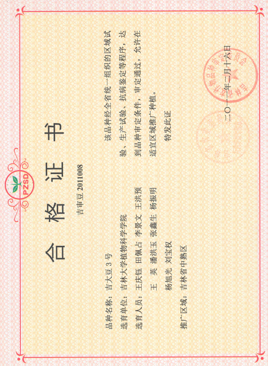 该品种为中熟品种,出苗至成熟130天。2009-2010年二年区域试验平均公顷产量2822.9公斤,2010年生产试验平均公顷产量2840.9公斤。田间自然诱发鉴定,抗大豆花叶病毒病,抗大豆灰斑病,中感大豆褐斑病,中抗大豆霜霉病,抗细菌性斑点病,感大豆食心虫。