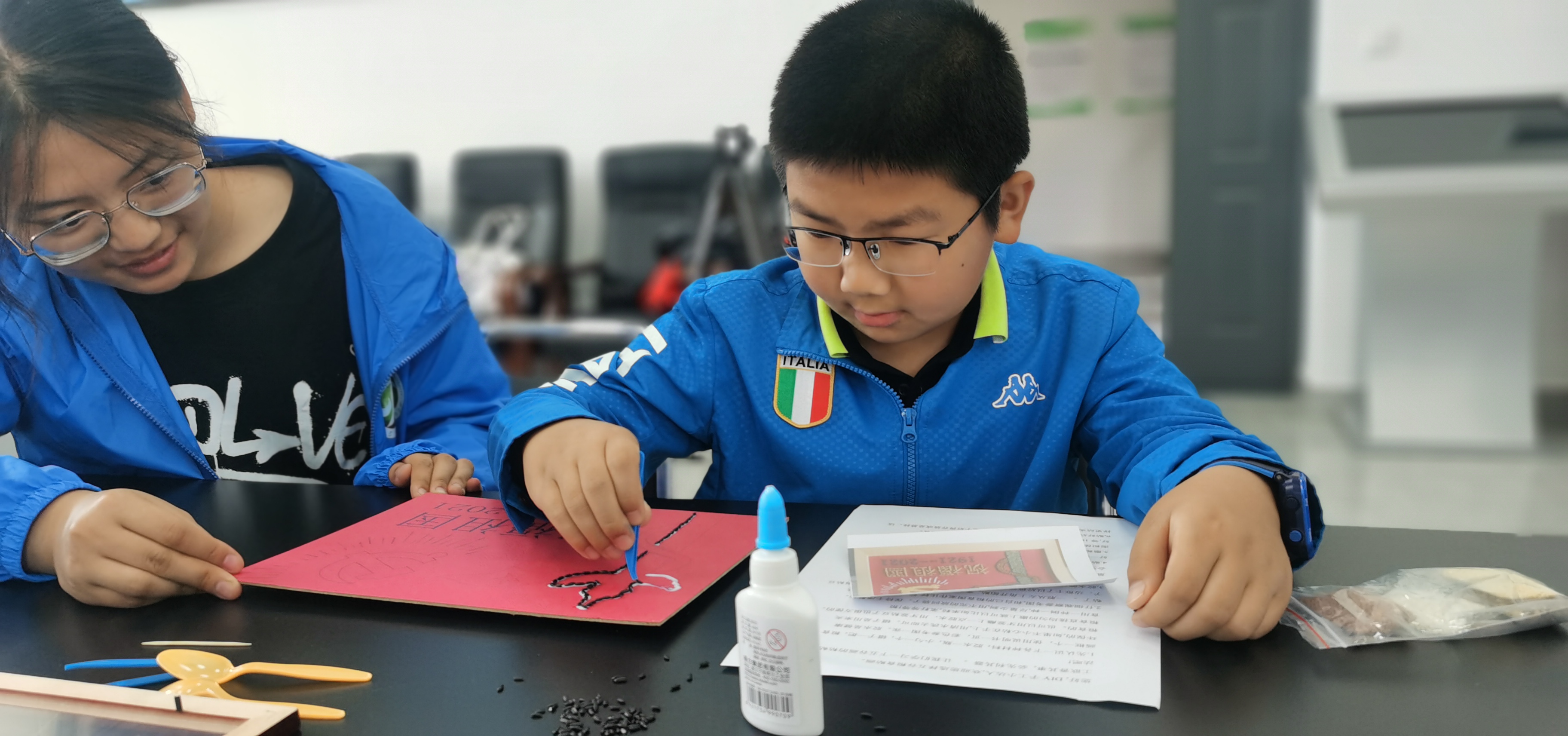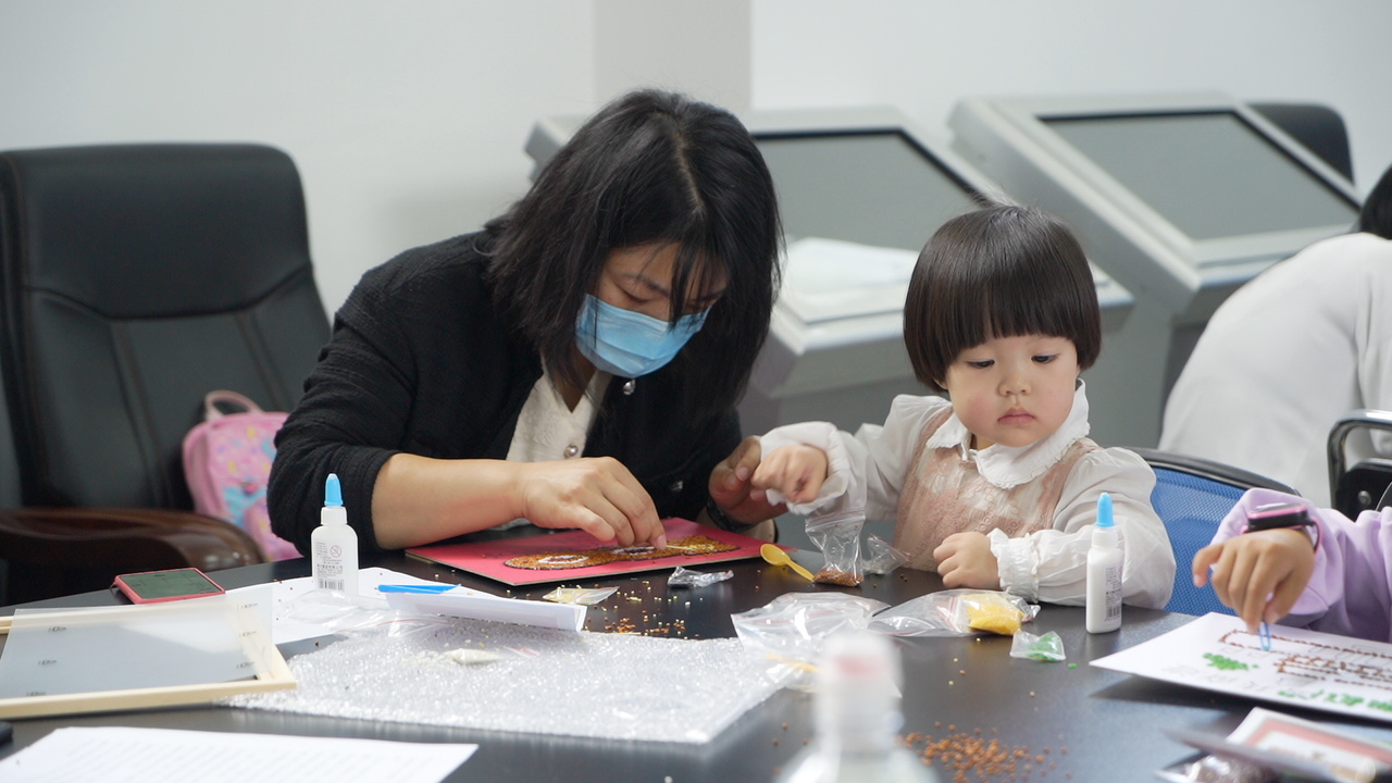 活动开始前,志愿者为大家介绍了种子画的相关知识,讲解了种子画的操作步骤及方法、制作要求以及注意事项等。五谷画制作是以五谷等各类植物果实种子为本体,通过粘、贴、拼、雕等手段,运用构图、线条、明暗、色彩等造型手法,经过特殊处理后形成的一种独特的视觉艺术形式。孩子与家长们都跃跃欲试。