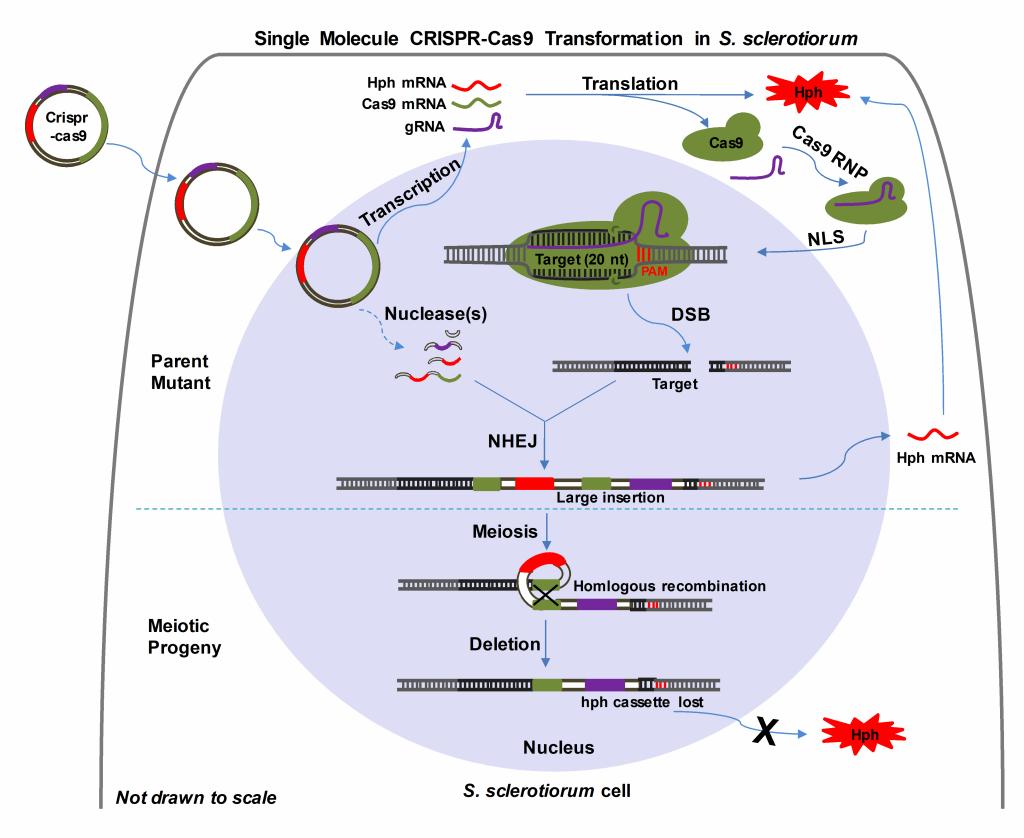 核盘菌(S.sclerotiorum)是引起作物菌核病的一种重要的植物病原真菌。其寄主范围极广,病害易流行。taptap点点体育潘洪玉教授带领的“作物重大病害流行预警及其绿色综合防控关键技术研究”吉林省重大科技研发人才团队,多年来致力于核盘菌致病和发育分子机理的研究。然而,基于传统的基因突变技术(同源重组、基因沉默、T-DNA插入及UV诱变)存在效率低、不稳定等问题,制约了核盘菌致病基因功能的研究,因此,急需开发新的、高效、经济及简便的基因突变技术。CRISPR技术是在上个世纪九十年代初发现的并在近几年迅速成为人类生物学、农业和微生物学等领域最流行的基因编辑工具。该论文报道了核盘菌CRISPR-Cas9介导的基因编辑策略及该技术在核盘菌未知基因功能领域的应用。该研究发现将编码Cas9、靶标sgRNA和标记基因的质粒转化到核盘菌中后,可对靶标基因造成高频率的插入突变。研究发现核盘菌在Cas9蛋白造成靶基因双链断裂(DSB)后,并在非同源末端修复(NHEJ)机制下将降解的质粒片段随机组合并整合到DSB位点,造成大片段插入的靶基因突变。因此,筛选标记(HygB)的辅助下,即可以获得含HygB抗性的插入突变体。该研究还发现,随机整合的大片段在同源序列存在的情况下,经核盘菌有性生殖阶段会因同源重组而发生片段丢失,因此又可以在子囊孢子中筛选到HygB抗性丢失的子代突变体。该编辑体系模型在三个独立的核盘菌野生型上进行了验证,并实现了对草酸相关基因(SsOah1)及黑色素相关基因(SsPks13)进行了高效突变。该研究结果不仅进一步确定了草酸在核盘菌致病上的关键作用,还发现了其对菌核和侵染垫的数量也有重要影响;同时发现侵染垫的色素积累对核盘菌的侵染及致病性无显著影响。CRISPR-Cas9技术在核盘菌中的开发和运用将进一步推动核盘菌后基因组时代,也会加速核盘菌致病相关基因的挖掘与功能研究,对于快速鉴定核盘菌新的致病因子及最终实现病害防治具有重要意义。