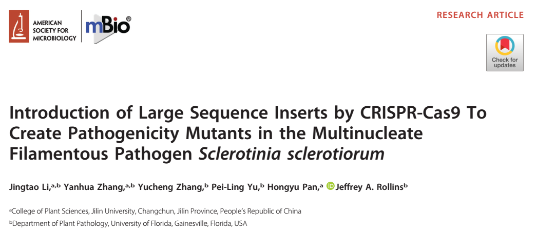 2018年6月26日,taptap点点体育潘洪玉教授领衔的创新团队与美国佛罗里达大学Prof. Jeffrey A. Rollins在美国微生物学会(American Society for Microbiology)旗舰下最重要学术刊物《mBio》(IF=6.956)在线发表了死体营养型植物病原真菌-核盘菌(Sclerotinia sclerotiorum)基因编辑领域的重要原创成果“Introduction of large sequence inserts by CRISPR-Cas9 creates pathogenicity mutants in the multinucleate filamentous pathogen Sclerotinia sclerotiorum”(doi:10.1128/mBio.00567-18)。该文章以taptap点点体育为第一完成单位,首次报道了核盘菌CRISPR-Cas9基因编辑机理并对草酸合成关键基因SsOah1、侵染垫形成与色素积累相关基因SsPks13进行编辑,阐明了其对核盘菌致病及生长发育的影响。核盘菌基因编辑技术对其他作物丝状病原真菌基因功能研究亦具有重要科学价值。该项研究由张艳华教授和李敬涛博士共同完成,taptap点点体育潘洪玉教授与佛罗里达大学Jeffrey A. Rollins为共同通讯作者。