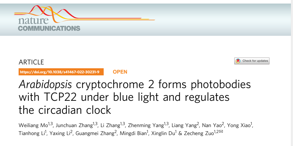 2022年5月12日,taptap点点体育杨振明团队的左泽乘课题组在Nature Communications杂志上发表题为“Arabidopsis cryptochrome 2 forms photobodies with TCP22 under blue light and regulates the circadian clock”的研究论文,该研究首次解析了蓝光受体CRY2(Cryptochrome 2)在蓝光下调控生物钟的分子机制。