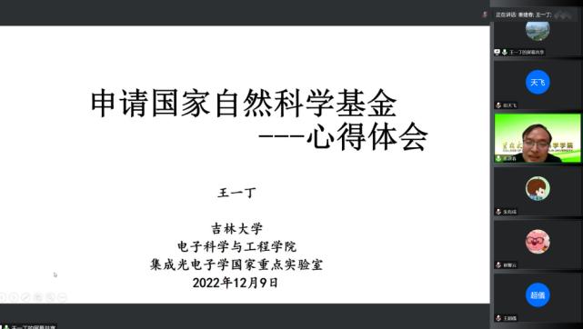最后,taptap点点体育电子科学与工程学院集成光电子国家重点实验室的王一丁教授做了“国家自然科学基金申请的心得体会”的精彩报告,王老师结合几十年申请基金的经验,提出要根据自己的研究内容认真选择四大分类,指出分类选择和关键词对评审的重要作用,同时,王老师还指出研究内容和研究方案写作的不同之处以及申请书写作中的低级错误如何避免。最后,王老师分析比较了国家级项目的不同要求,鼓励老师们敢于申报各种国家重大项目。