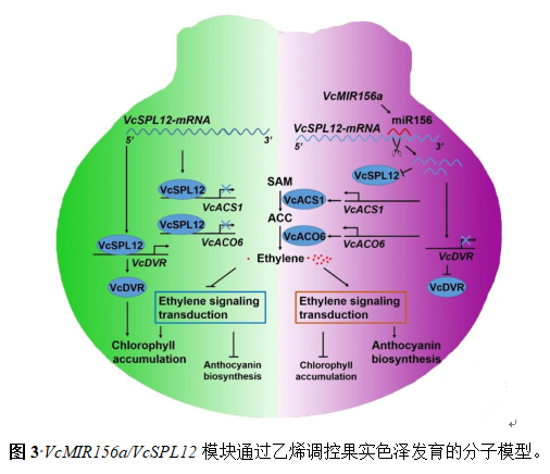 综上所述,在蓝莓果实生长阶段,由于VcSPL12的高表达导致乙烯合成相关基因VcACO6与VcACS1的表达受到抑制,从而使乙烯维持在一个低水平状态,进而引起叶绿素的积累并抑制花青素合成(图3)。在果实成熟开始时,由于VcMIR156a产生的miR156导致VcSPL12的降解,从而促进乙烯的产生,进而触发叶绿素的降解和花青素的合成。该研究大大提升了人们对miR156/SPL在果实着色过程中的生物学功能及其调节机制的认识。