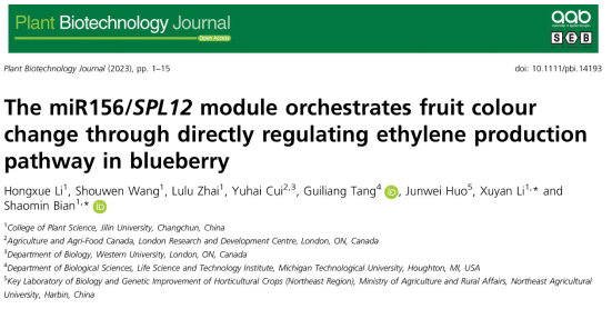 2023年10月5日,taptap点点体育边少敏教授团队在Plant Biotechnology Journal(IF 13.8)上发表了题为“The miR156/SPL12 module orchestrates fruit colour change through directly regulating ethylene production pathway in blueberry”的研究论文,首次证实miR156/SPL12可以直接抑制乙烯合成的关键酶基因VcACS1(ACC SYNTHETASE1)和VcACO6(ACC OXIDASE6)的表达从而抑制蓝莓中的乙烯合成,并进一步影响果实成熟过程中叶绿素的降解与花青苷的积累。该研究为植物中miR156/SPL介导的调节与乙烯信号途径之间的联系提供了新的见解。