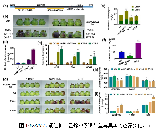 该研究以稳定遗传的VcMIR156a和VcSPL12过表达蓝莓植株为材料,通过转录组与代谢组联合分析发现,VcMIR156a促进花青苷与乙烯合成相关基因的表达,提升花青苷和乙烯的积累;同时抑制叶绿素的积累及其相关基因的表达。而其靶标基因VcSPL12在蓝莓中过表达则表现出完全相反的趋势。进一步借助果实瞬时过表达及病毒介导的RNA沉默(VIGS)技术展开研究,结果发现在蓝莓果实中过表达VcSPL12抑制了乙烯的生物合成与花青苷积累,提高了叶绿素含量,而VcSPL12表达下调后表现出相反的趋势(图1)。同时,乙烯模拟物(乙烯利)/乙烯抑制剂(1-MCP)处理已注射蓝莓果实从很大程度上削弱/模拟了VcSPL12对色素积累的影响。以上结果说明,蓝莓miR156/SPL12能够通过调控乙烯的合成从而影响蓝莓果实中叶绿素和花青苷的积累。