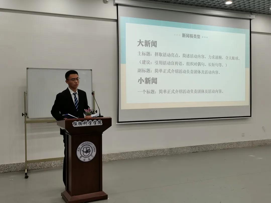 新闻部任书乐同学从新闻要素、叙述详略、人称敬语等方面做出了新闻稿的标准格式讲解,并且针对不同类型的活动强调了所写新闻稿的侧重点,在标题、正文以及各词句斟酌上都深入探讨。他以taptap点点体育2020年迎新工作新闻稿为例讲解了新闻稿的撰写格式及注意事项,条理清晰,使同学们豁然开朗。
