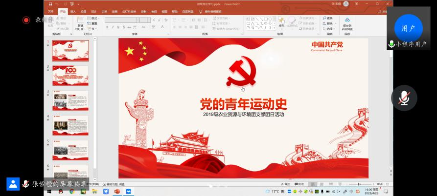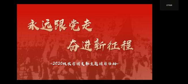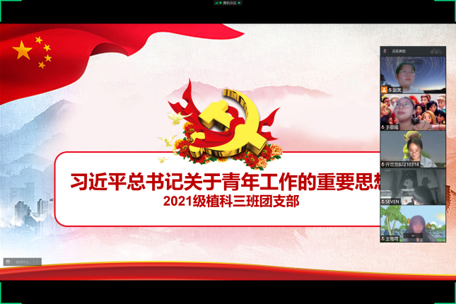 5月3日,2020级农学专业团支部于线上展开“永远跟党走,奋进新征程”主题团日活动,继续学习中国共青团的百年征程,为同学们介绍这百年来的峥嵘岁月。旨在鼓励全体团员学习党的精神,在新世纪的征途上,沐浴晨曦的阳光,唱着新一代春天的故事。