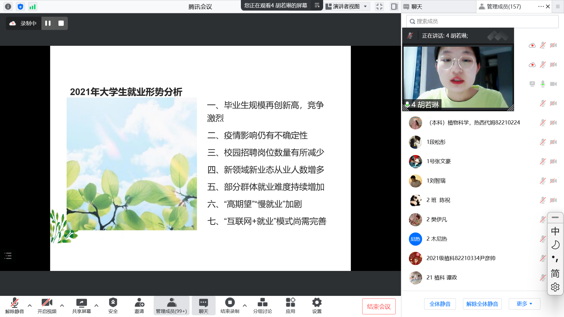 赛后,高梦玉作总结发言。高梦玉首先对各组在资料收集、成果展示、小组协作等方面表示高度认可和赞扬,各组PPT制作风格不一,但都较为精美,小组成员在资料的查找上也做到了方向全面、内容优质。其次,高梦玉对本学期大学生职业发展与就业创业指导课程情况进行了总结,强调了大一年级开设职业规划课程的意义,希望同学们能够结合国家农业的发展情况及农学学科的特点,关注国家大事,紧跟时代变化,做好自身职业规划;建议同学们从现在开始要有意识的规划自己以后的道路和人生,向着既定的目标努力。