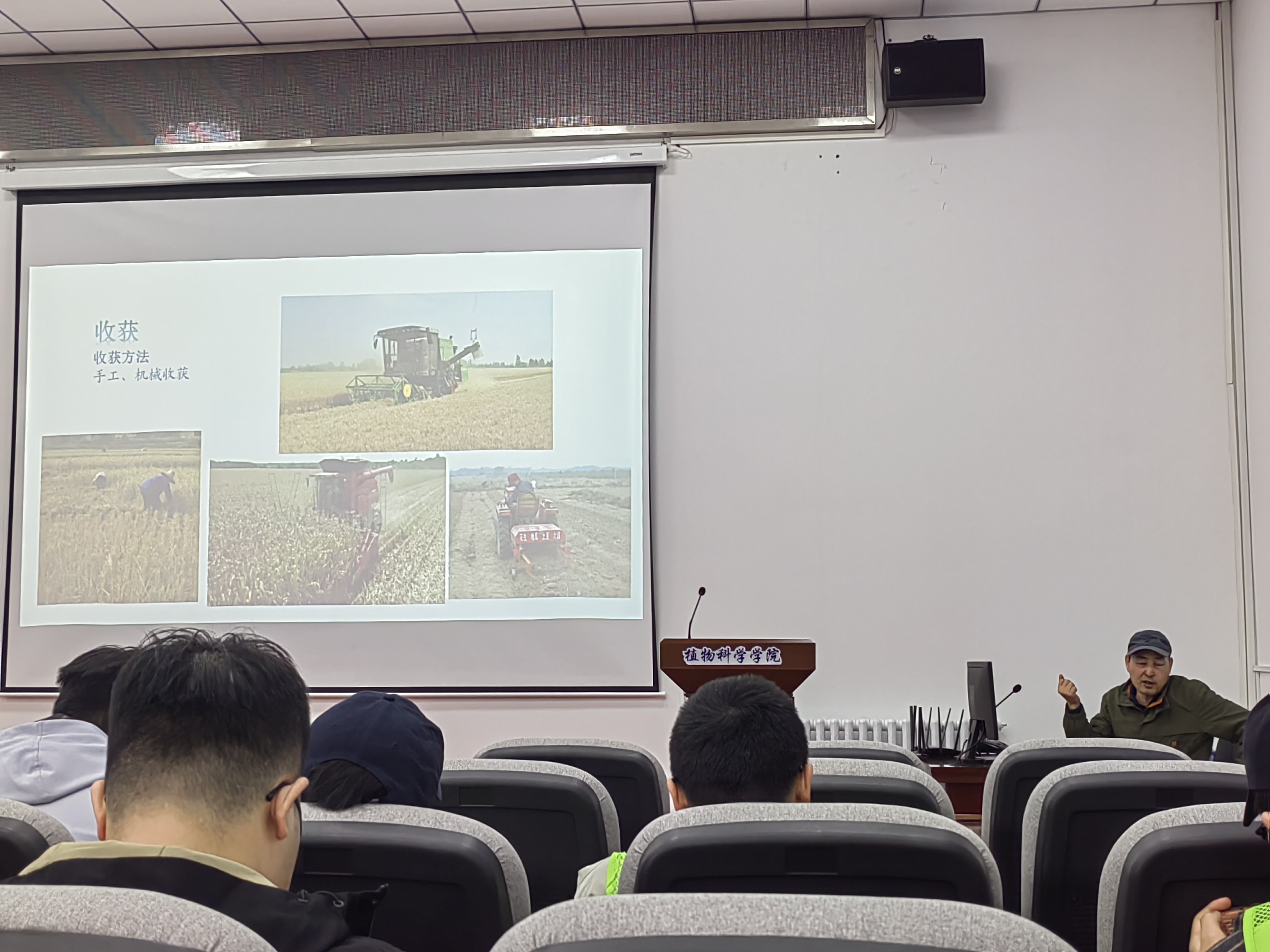 活动开始,作物学系教授李景文组织学生在智慧农业梦工场观看农作物播种、秋收等相关视频,为学生讲解农作物分类、农机具发展史、农机具在播种及秋收时的应用,并对学生提出的相关问题进行了细致解答。随后,实践基地工作人员为学生分发手套、播种器等一系列工具,带领学生前往实践教育基地。在基地内,李景文教授实地介绍了垄台、垄沟、土壤肥力梯度方向及试验田小区分区的方法,鼓励在场学生将所学知识与实践结合在一起,更好地理解书本中的内容,更深层次地体会劳动者的不易。介绍完毕,李景文教授亲自示范播种器的使用,并手把手教学生如何高效播种。师生一同体验播种的喜悦,将一粒粒希望的种子播撒在肥沃的土地上。整个过程氛围温暖,承载着梦想的种子在明媚春光的照耀下悄然生长。活动结束后,师生合影留念,师生沉浸在耕种收获的喜悦当中。