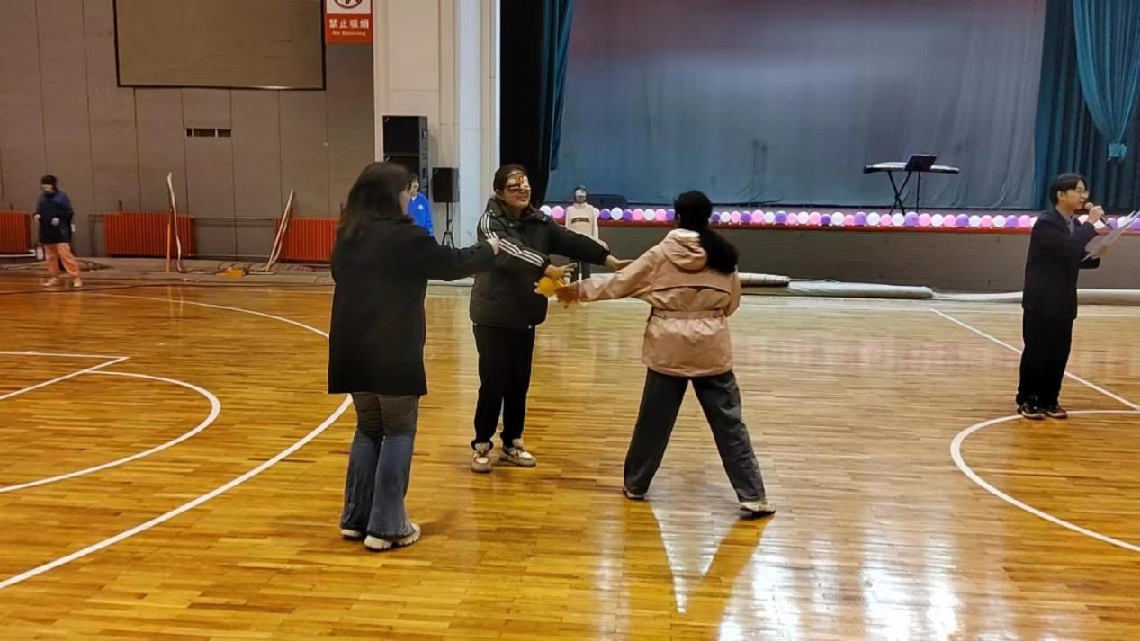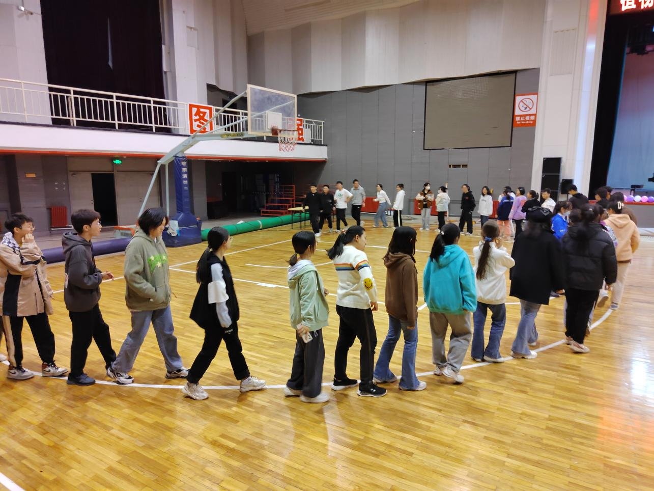 游戏环节的尾声,是我们的难度增加级——你说我走。赛道上的三名同学蒙眼,两名同学原地转圈后走向下一个同学,有的同学平衡感超强,短短几秒完成自己的任务,有的同学迷失在队友的呼唤当中,在队友的耐心指导下,每组同学都完成了这场象征着团结的游戏。