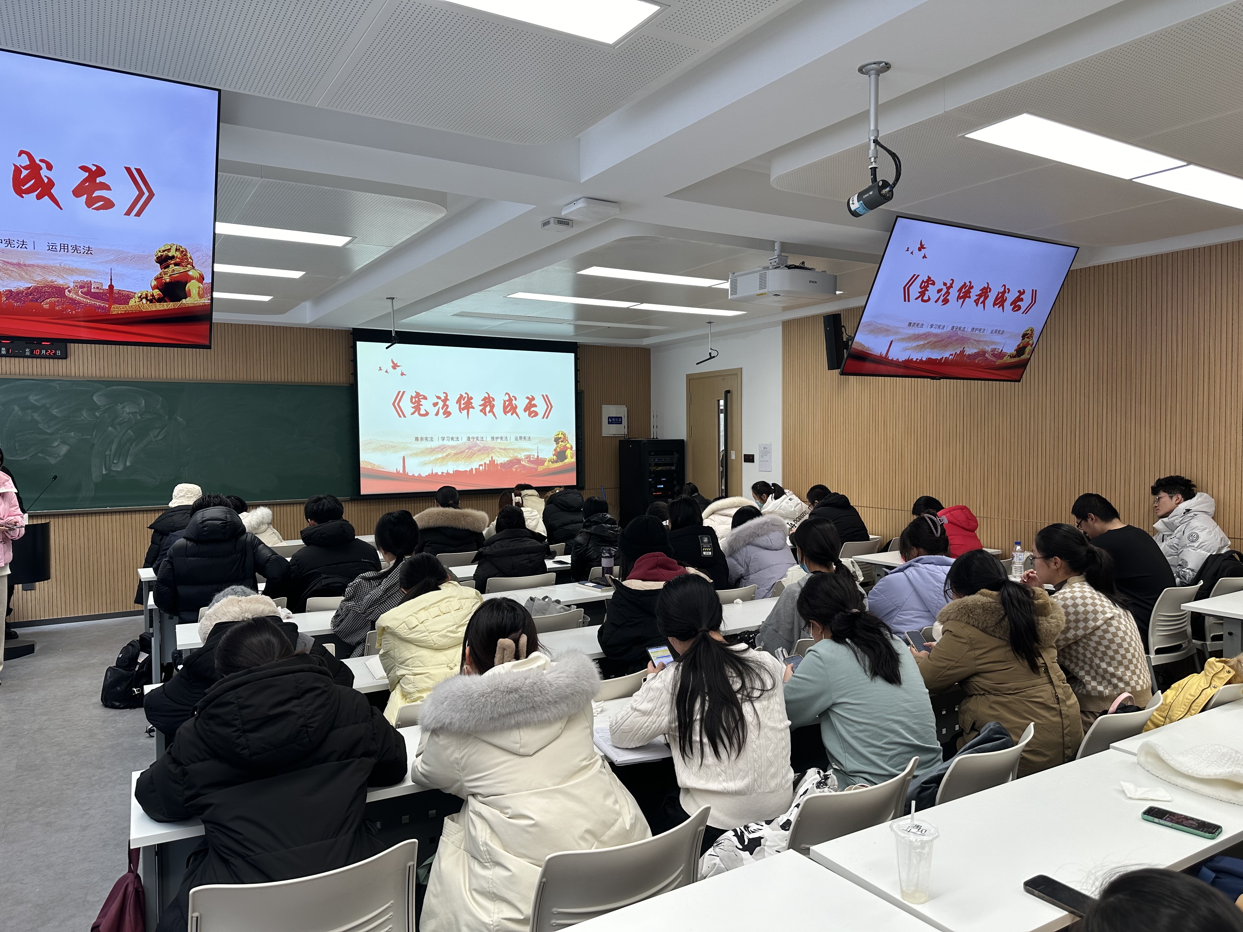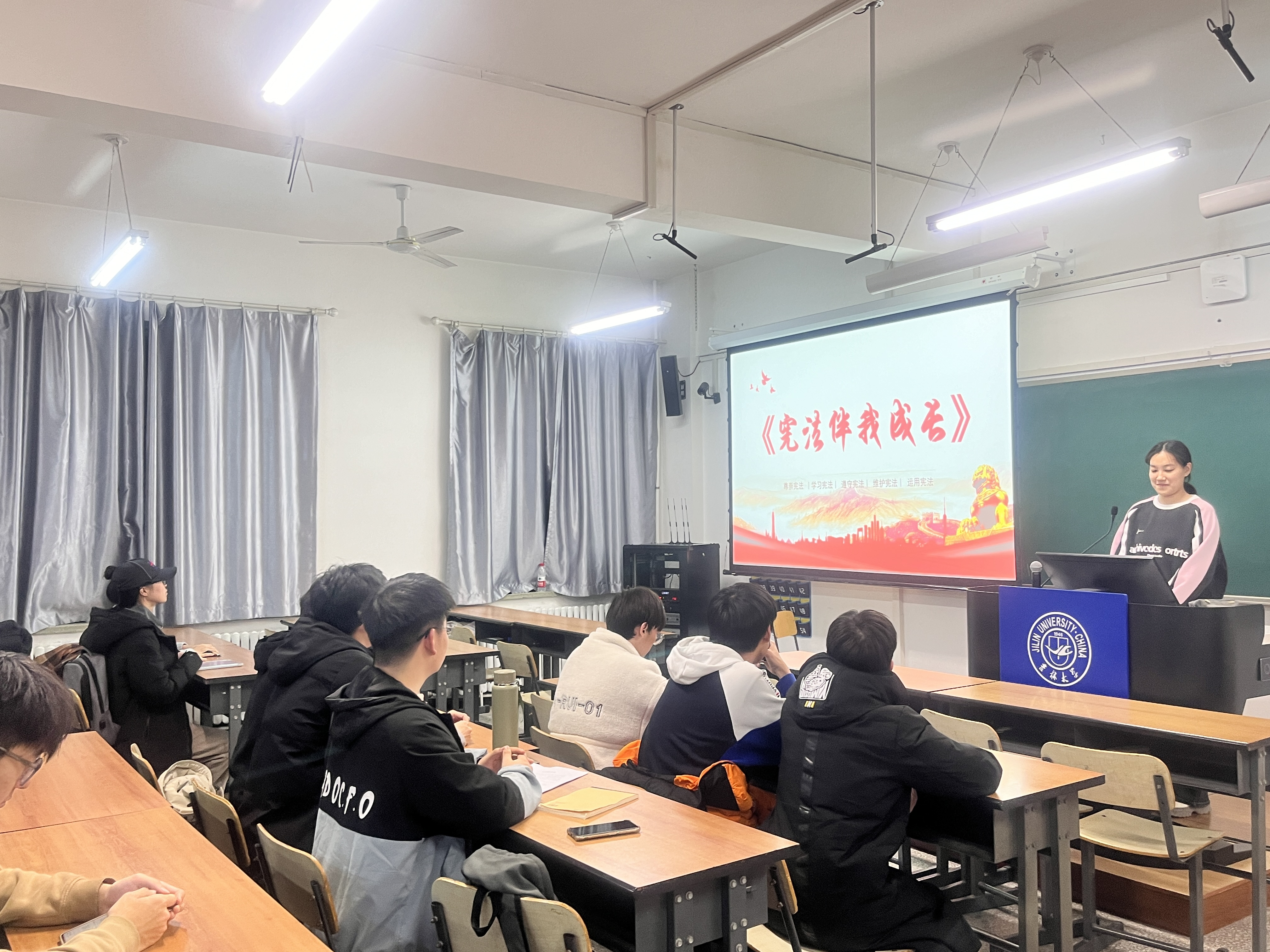 各团支部组织开展了宪法晨读、观看第九届国家宪法日教育系统“宪法晨读”直播、宪法歌曲学习传唱等形式多样的学习活动,带领学院学生深入学习贯彻习近平法治思想和习近平总书记关于宪法的重要论述,并举办宪法知识问答,以普法为主要目的,将宪法知识学习与现场竞赛相结合,进一步鼓励同学们学习宪法知识、培养法治思维。鼓励学院学生学习法治知识,增强法治意识,营造 “学法、知法、守法、护法”校园法治文化,将宪法精神进一步融入今后的学习与生活中。同时,对领学宪法宣传周的总体要求进行阐述,表明我们要以习近平新时代中国特色社会主义思想为指导,深入学习贯彻党的二十大精神,切实提高政治站位,增强“四个意识”,坚定“四个自信”,做到“两个维护”,确保宪法宣传的正确政治方向和舆论导向。要突出主题,深入学习宣传习近平法治思想,引导全社会坚定不移走中国特色社会主义法治道路。
